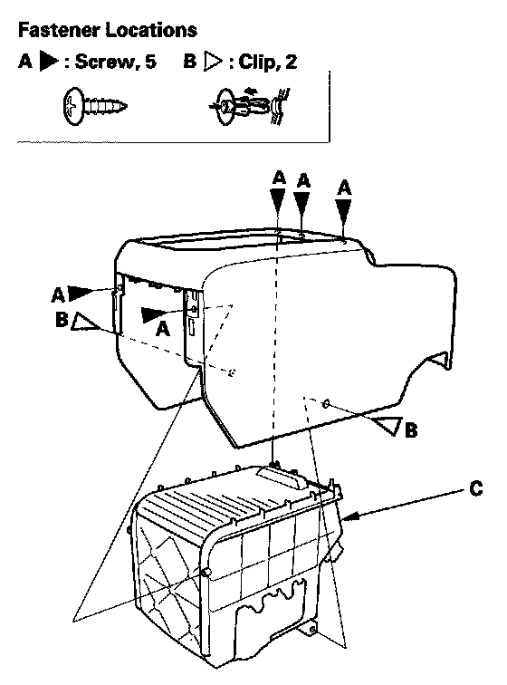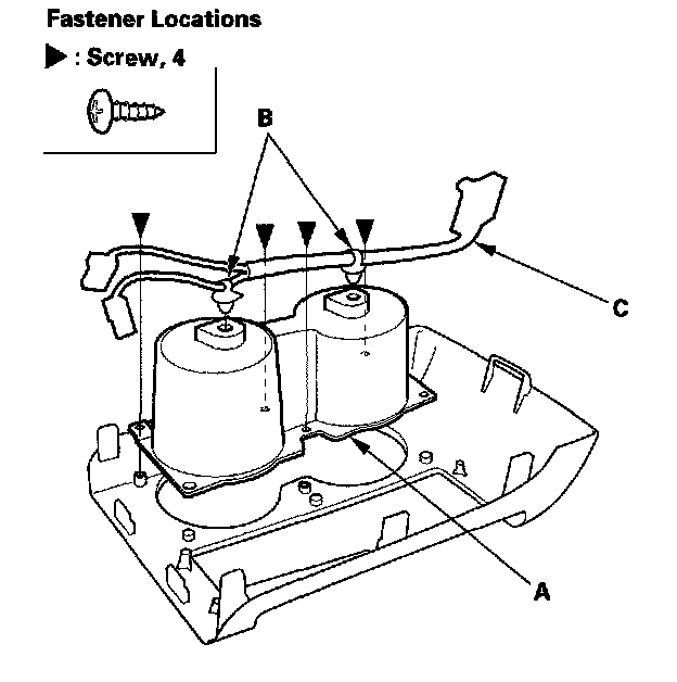 4. Remove the screws, then remove the cup holder (A). Detach the harness clips (B), and remove the console subharness (C) from the cup holder.