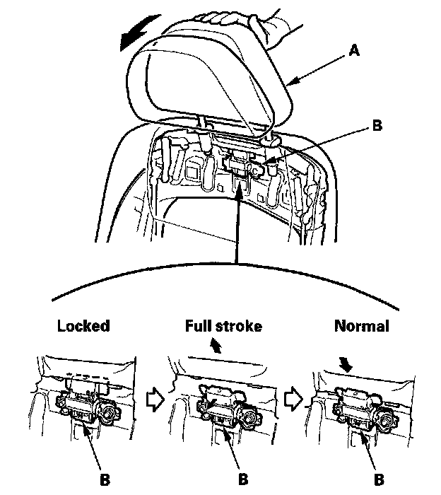1. Push the head restraint (A) forward fully from the locked position to return the inside inertia lock (B).