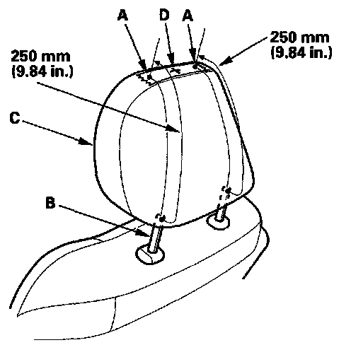 5. Make marks (A) on both sides at 250 mm (9.84 in.) upward from the posts of the head restraint frame (B) along the back of the head restraint (C) surface. Make a center of these points as a datum point (D).