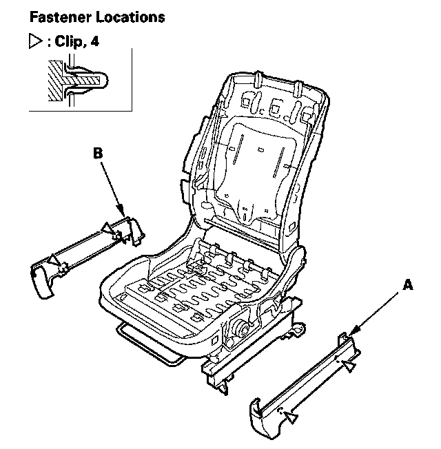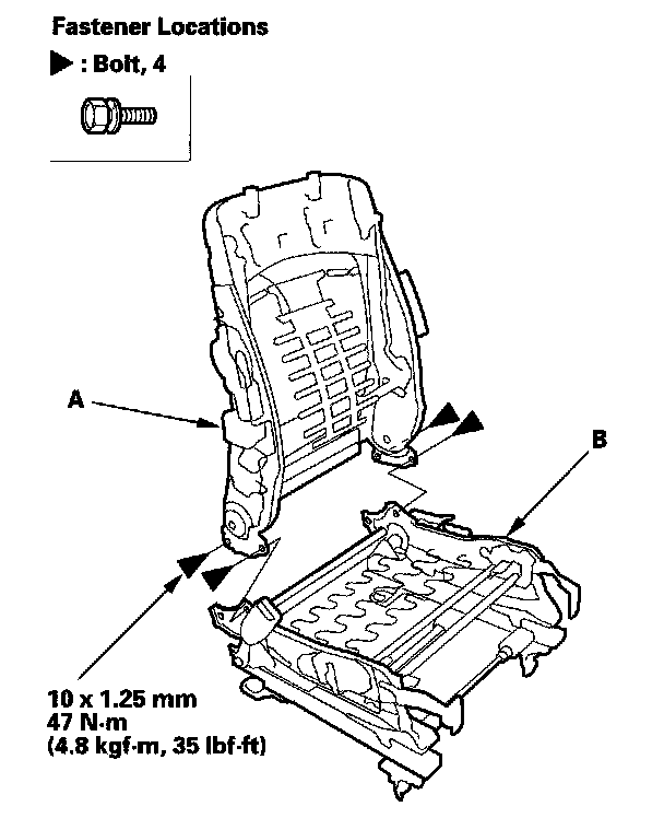9. Remove the bolts, then separate the front seat-back flame (A) and seat cushion flame (B).