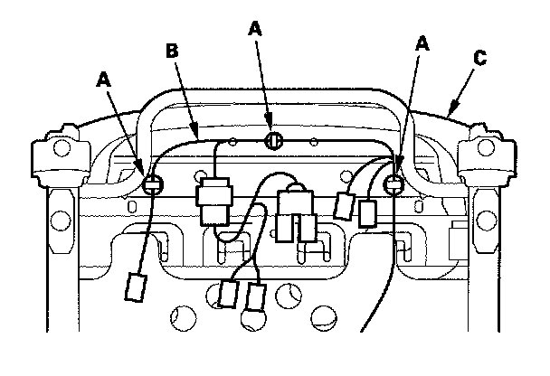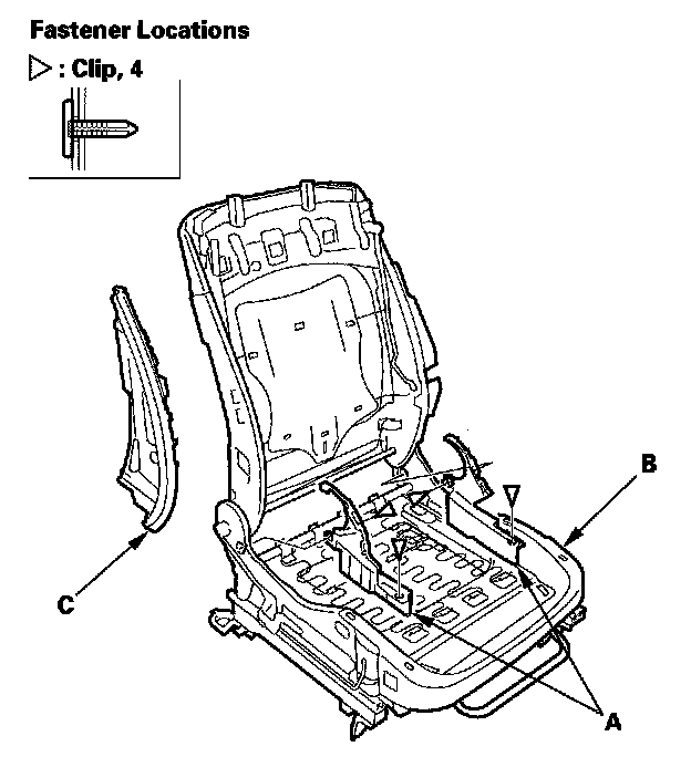 5. Detach the harness clips (A), and remove the seat subharness (B) from the seat cushion frame (C).