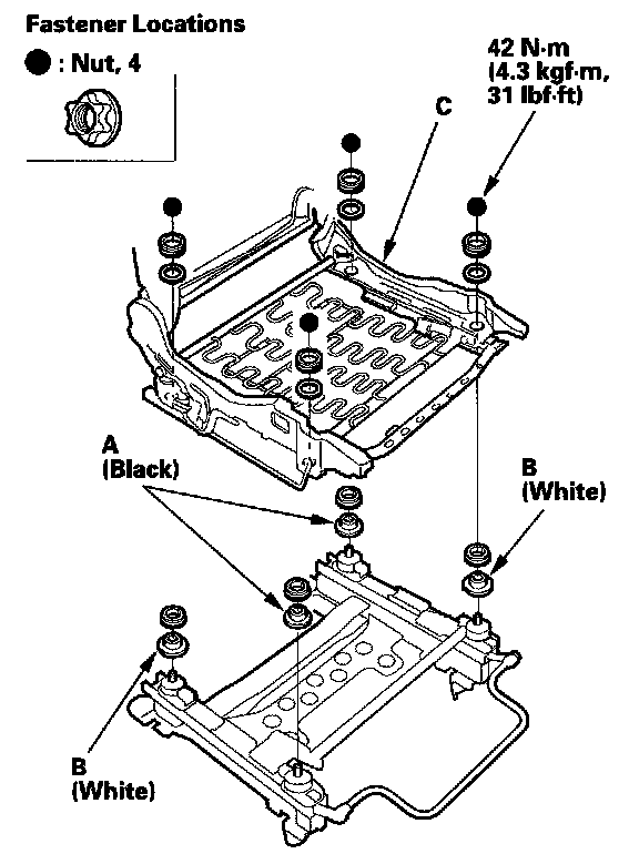 4. Install a new seat frame in the reverse order of removal, and note these items: