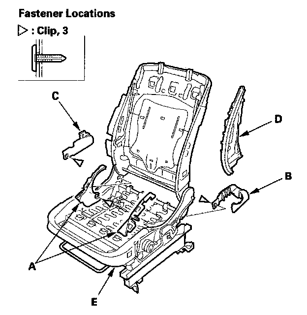 3. Remove the clips, then remove the recline inner covers (A), outer upper rail cover (B), inner upper rail cover (C) and the module holder (D) from the seat frame (E).