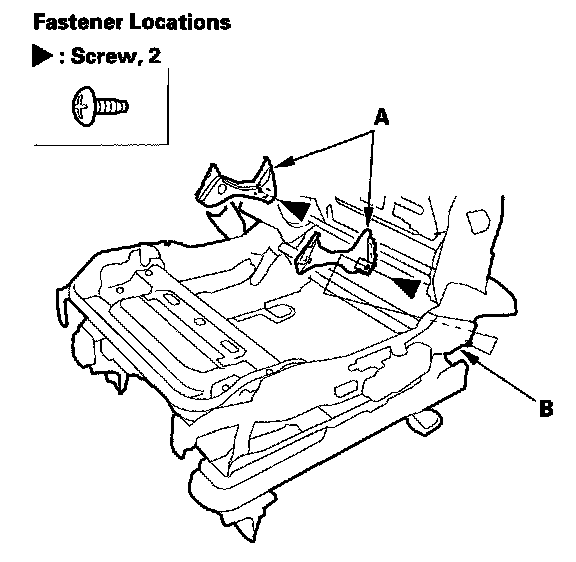 3. Remove the screws, then remove the recline inner covers (A) from the seat frame (B).