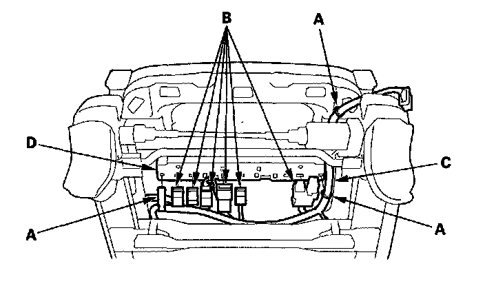 5. Detach the harness clips (A) and connector clips (B) to remove the seat subharness (C) from the front seat harness holder (D).
