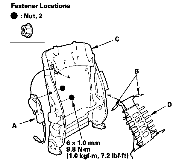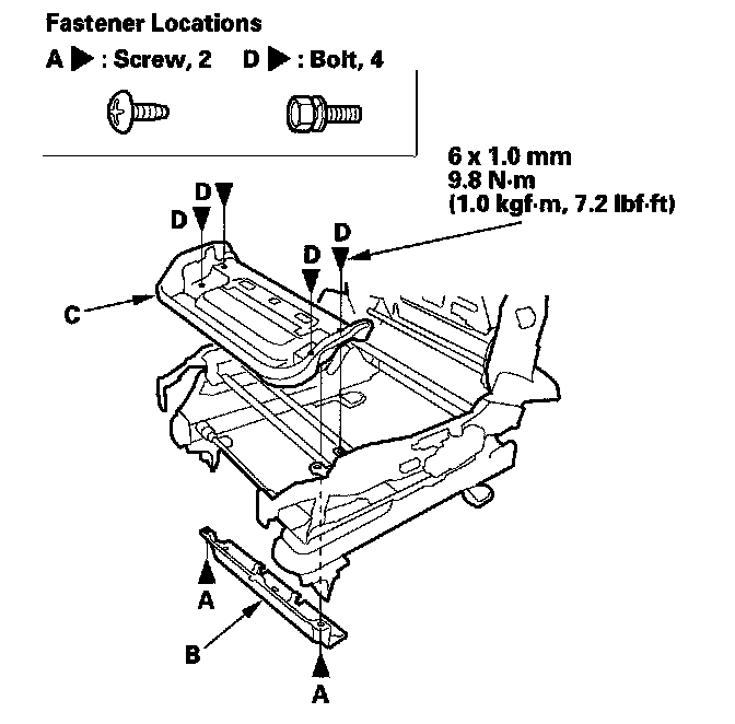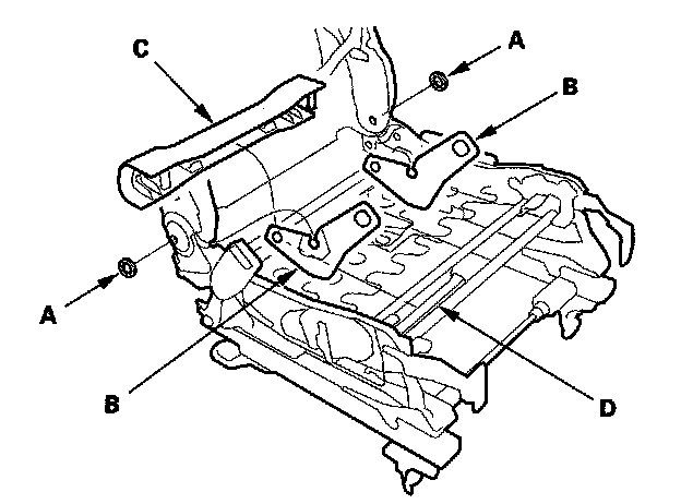 6. Remove the screws (A), and remove the front seat harness holder (B) from the seat cushion frame (C). Remove the bolts (D), and remove the seat cushion frame front the front seat frame.