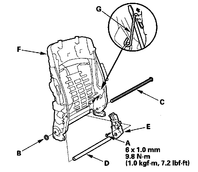 10. Remove the bolt (A) and push nut (B), then remove the connecting rod (C), rod cover (D), and recline motor (E) from the seat-back flame (F). Release the both lower springs (G) of the lumber support from the seat-back flame.