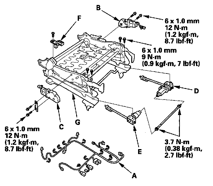 12. Disconnect the harness connectors and harness band, and remove the driver's seat harness (A). Remove the rear up-down motor (B), front up-down motor (C), slide motor/left side gearbox (D), right side gearbox (E), and seat position sensor (F) from the slide/up-down adjuster (G).
