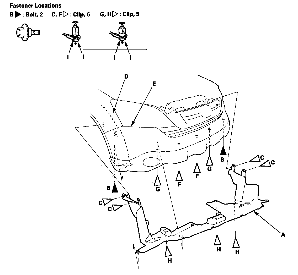 1. Remove the bolts (B), then remove the clips (C) that secure the front inner fender (D) and front splash shield to the body.