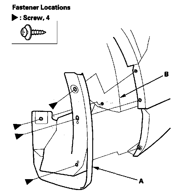 1. Remove the screws, then remove the rear splash guard (A) from the rear bumper (B) and body.
