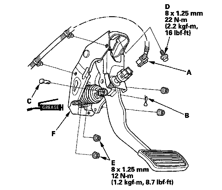 5. Remove the brake pedal with bracket (F).