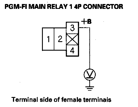 69. Measure voltage between PGM-FI main relay 1 4P connector terminal No. 1 and body ground.