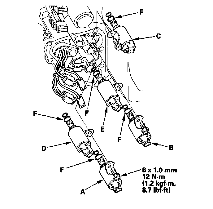 24. Install new O-rings (two O-rings per solenoid valve) (F) on the reused solenoid valves.
