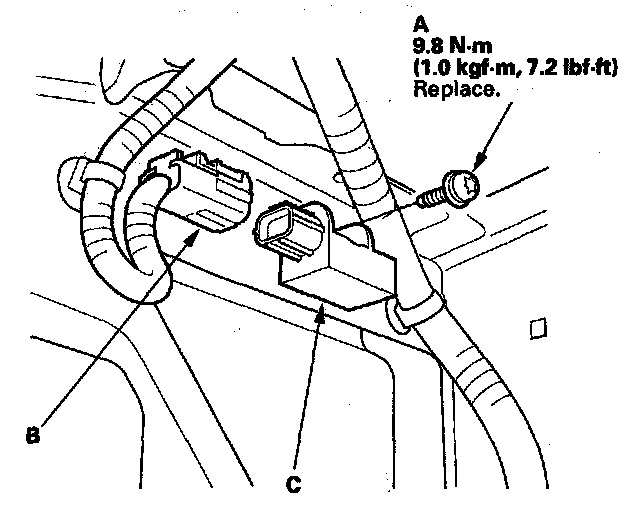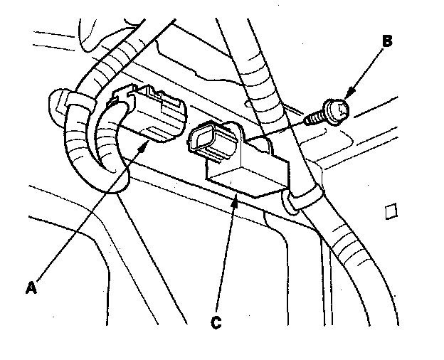 1. Install the new front impact sensor with a new TORX bolt (A), then connect the engine compartment wire harness 2P connector (B) to the front impact sensor (C).