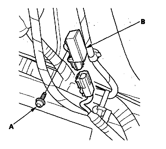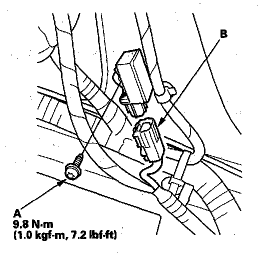 1. Install the new side impact sensor (first) with the TORX bolt (A), then connect the floor wire harness 2P connector (B) to the side impact sensor (first).
