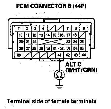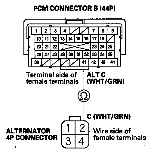13. Check for continuity between PCM connector terminal B41 and alternator 4P connector terminal No. 2.