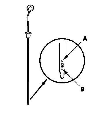 5. Remove the dipstick, and check the fluid level. It should be between the upper mark (A) and the lower mark (B).