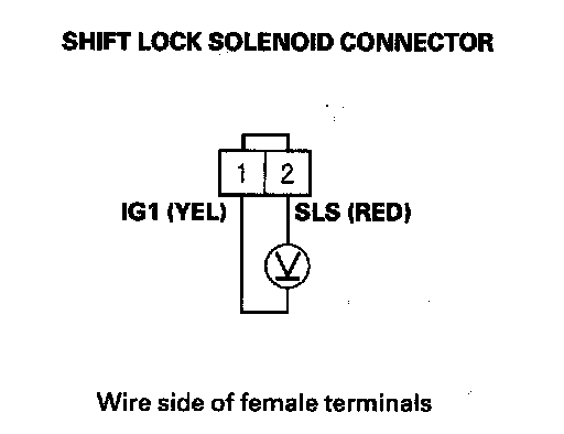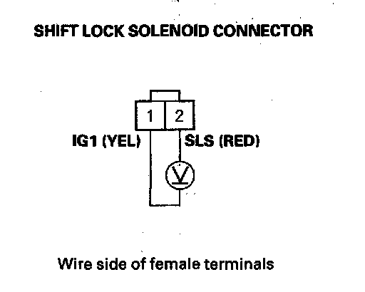 8. Measure the voltage between shift lock solenoid connector terminals No. 1 and No. 2 while pressing the brake pedal.