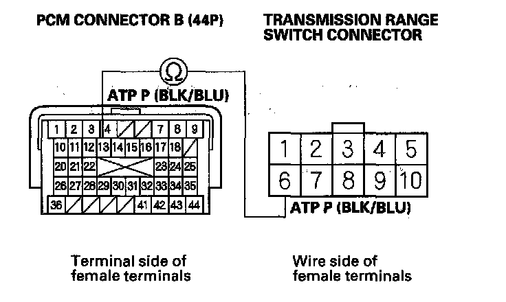 27. Check for continuity between PCM connector terminal B13 and transmission range switch connector terminal No. 6.