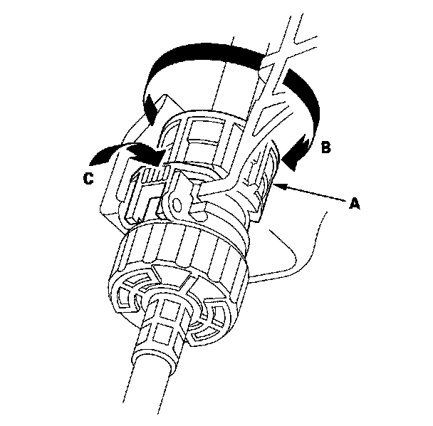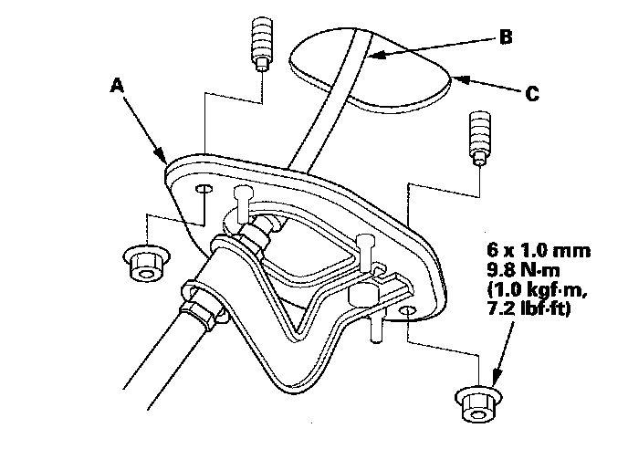 12. Insert a new shift cable through the grommet hole (C), and install the grommet in its hole. Do not bend the shift cable excessively.