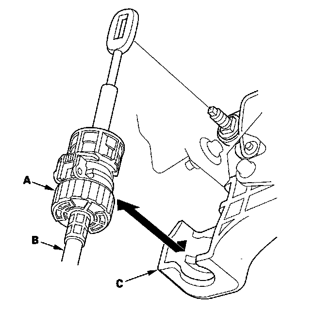 7. Lower the socket holder (A), then slide it to remove the shift cable (B) from the shift cable bracket (C).