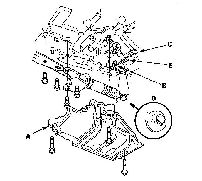 9. Remove the spring clip (B) and the control pin (C), and separate the shift cable end (D) from the control lever (E). Remove the bolts securing the shift cable brackets.