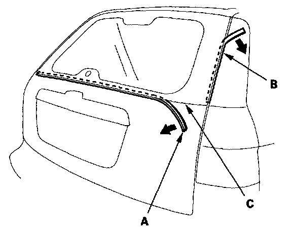 2. Remove the lower rubber dam (A) and side rubber dams (B) from the edges of the rear window (C). If necessary, cut the rubber dams with a utility knife.