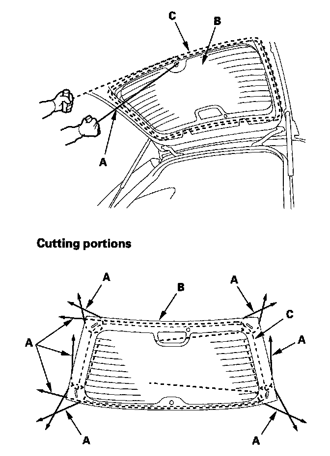 6. With a helper on the outside, pull the piano wire (A) back and forth in a sawing motion. Hold the piano wire as close to the rear window (B) as possible to prevent damage to the tailgate, and carefully cut through the adhesive (C) around the entire rear window.