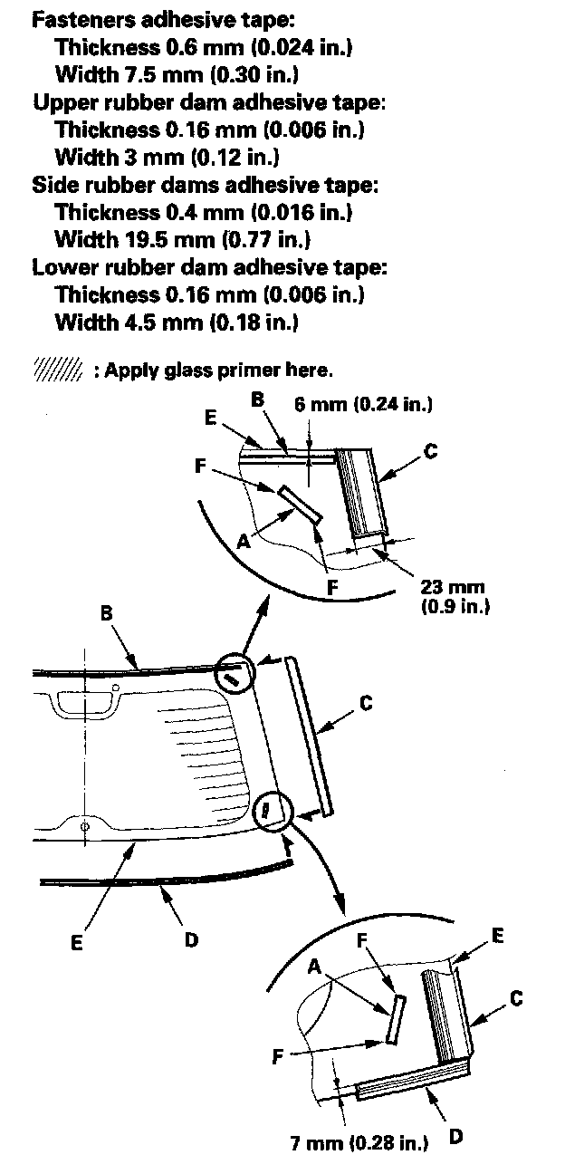 11. Attach the fasteners (A), upper rubber dam (B), side rubber dams (C), and lower rubber dam (D) with adhesive tape to the inside face of the rear window (E) as shown. Before installing the side and lower rubber dams, apply primer to the inside face of the rear window.