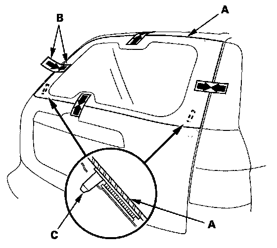 14. Set the rear window (A) in the opening, and center it. Make alignment marks (B) across the rear window and body with a grease pencil at the four points shown. Make sure both clips (C) contact with the holes of the tailgate corner. Be careful not to touch the rear window where adhesive will be applied.