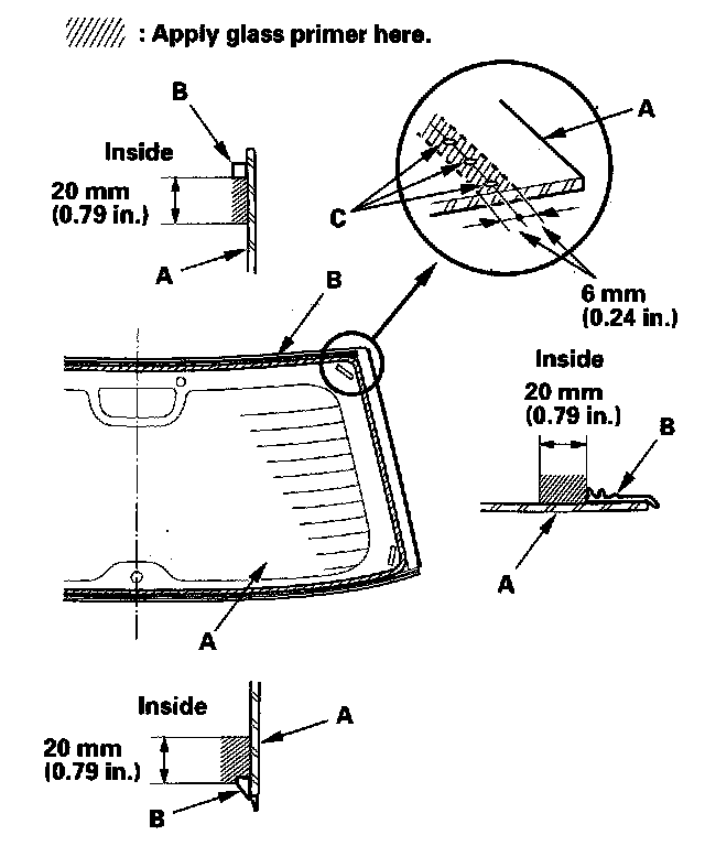 - With the printed dots (C) on the rear window as a guide, apply the glass primer to both side portions of the rear window.