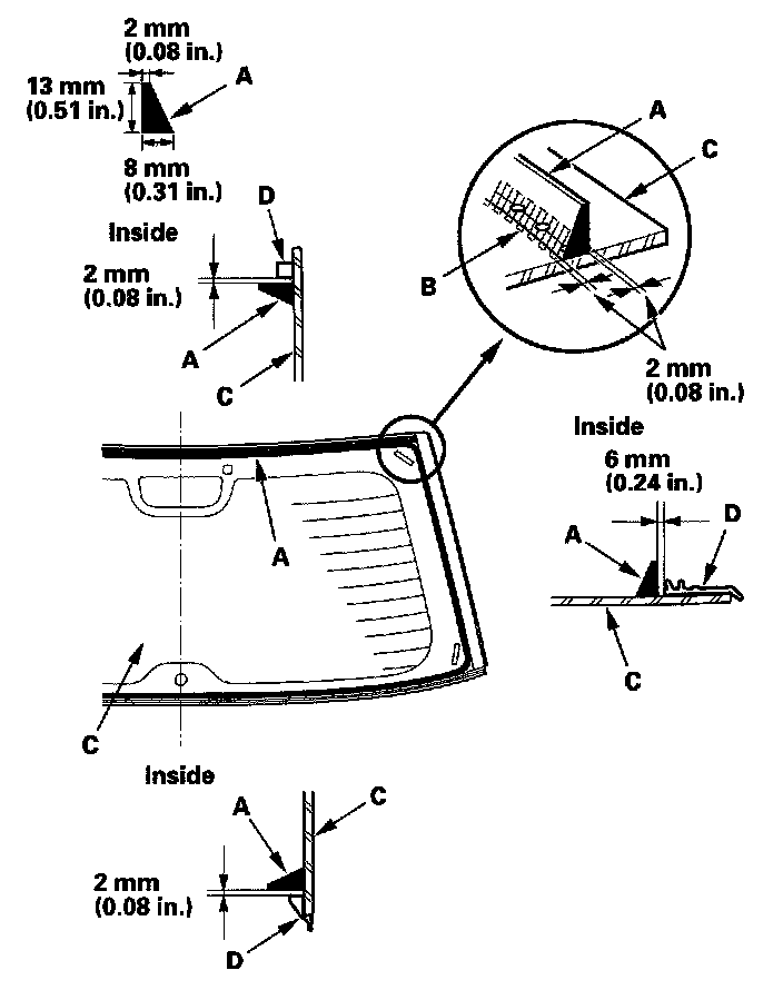 19. Put the cartridge in a caulking gun, and run a bead of adhesive (A) on the glass primer trace (B) around the edge of the rear window (C) and along the rubber dams (D) as shown.