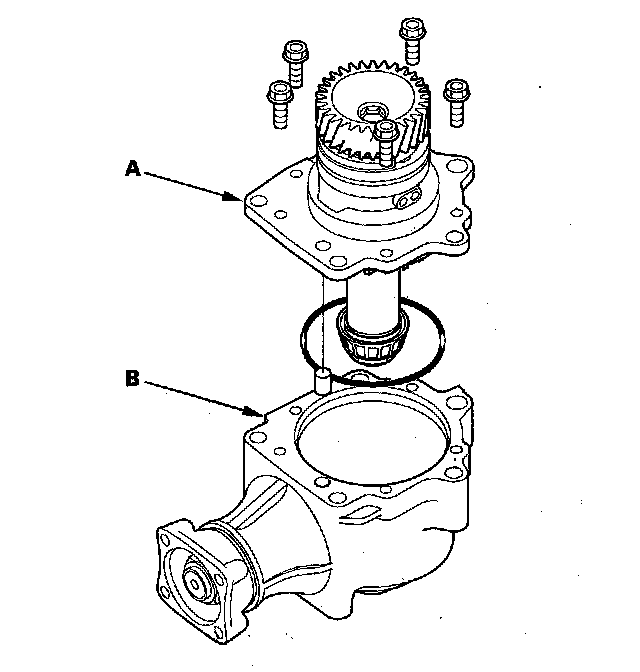 3. Secure the transfer housing (A) in a bench vise (B) with soft jaws. To prevent damage to the transfer housing, always use soft jaws or equivalent materials between the transfer housing and a vise.