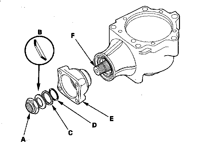 6. Remove the locknut (A), the conical spring washer (B), the back-up ring (C), the O-ring (D), and the companion flange (E) from the transfer output shaft (F).