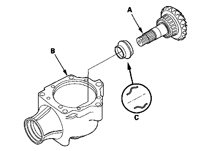 7. Remove the transfer output shaft (A) from the transfer housing (B), then remove the transfer spacer (C) from the transfer output shaft.