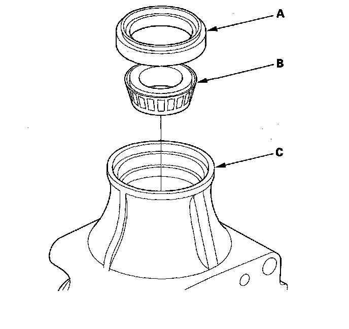 8. Remove the oil seal (A) and the tapered roller bearing (B) from the transfer housing (C).