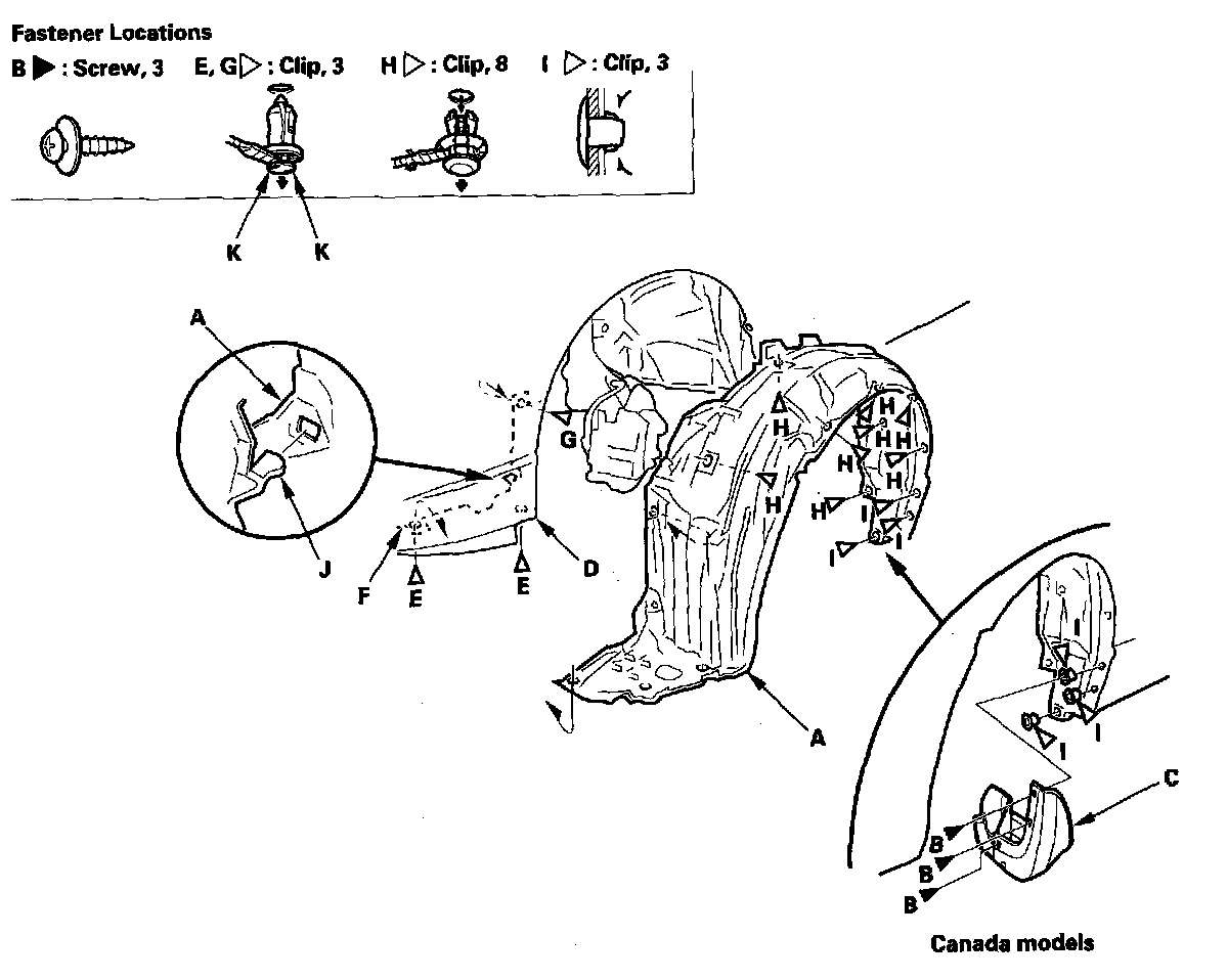 3. From the wheel arch, remove the clips (G, H, I) securing the front inner fender (and the splash shield) to the body.