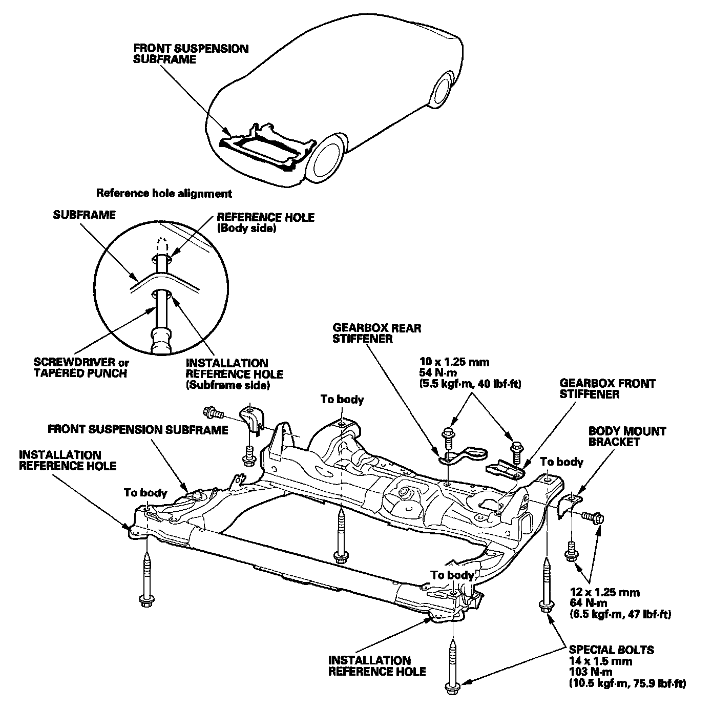 - When installing, align both installation reference holes in the subframe with both reference holes in the body using a screwdriver or tapered punch as a guide.