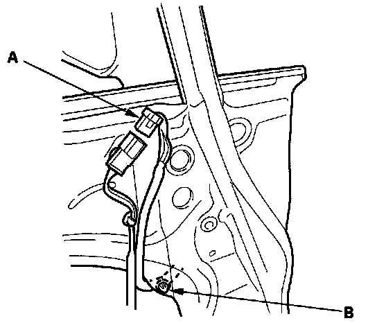 3. Disconnect the connector (A), and detach the harness clip (B).