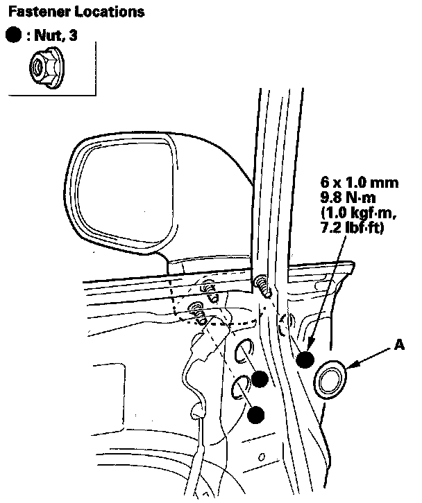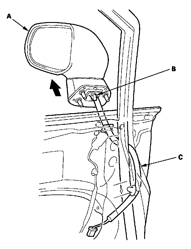 5. While holding the mirror (A), detach the clip (B), then remove the mirror, and pull the harness (C) out through the hole in the door. Take care not to scratch the door.