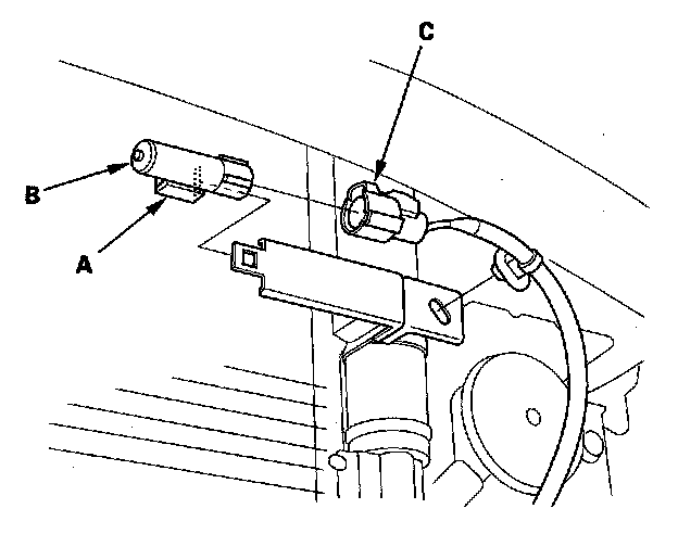 2. Lift the tab (A) to release the lock, then remove the outside air temperature sensor (B) from the receiver/dryer desiccant bracket. Disconnect the 2P connector (C) from the outside air temperature sensor.