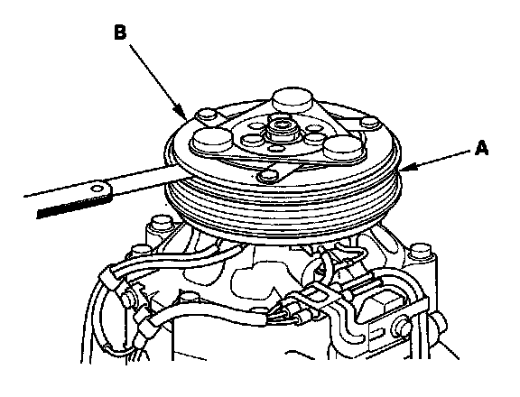 3. Measure the clearance between the rotor pulley (A) and the armature plate (B) all the way around. If the clearance is not within specified limits, remove the armature plate and add or remove shims as needed to increase or decrease clearance.