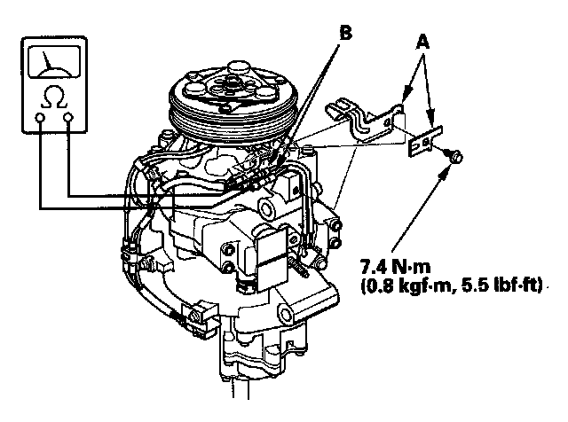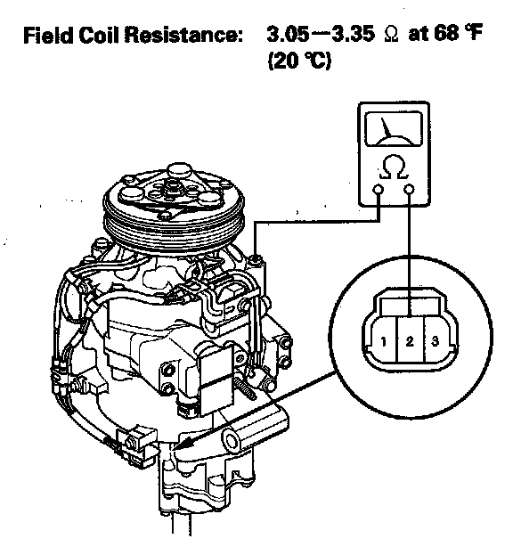 4. Measure the resistance between the A/C compressor clutch connector No. 2 and A/C compressor of the field coil. If resistance is not within specifications, replace the field coil.