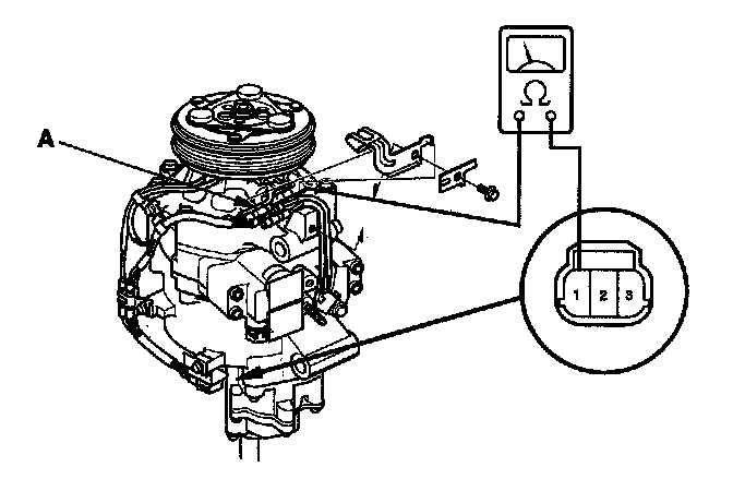 6. Check the thermal fuse for continuity between the A/C compressor clutch connector No. 1 terminal and the 1P connector (A). If there is no continuity, replace the field coil.