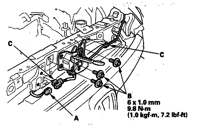 10. Disconnect the hood latch switch connector (A), then remove the mounting bolts (B) and the clamps (C).