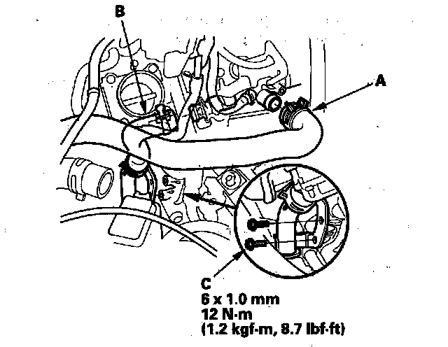 14. Disconnect the upper radiator hose (A) and the lower radiator hose (B), then remove the water lower pipe mounting bolts (C).