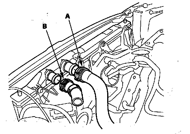 20. Disconnect the upper radiator hose (A) and the water filler hose (B).