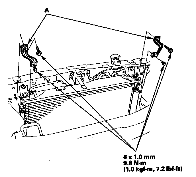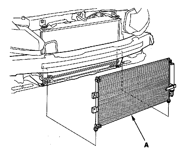7. Remove the A/C condenser (A). Be careful not to damage the radiator and A/C condenser fins when removing the A/C condenser.