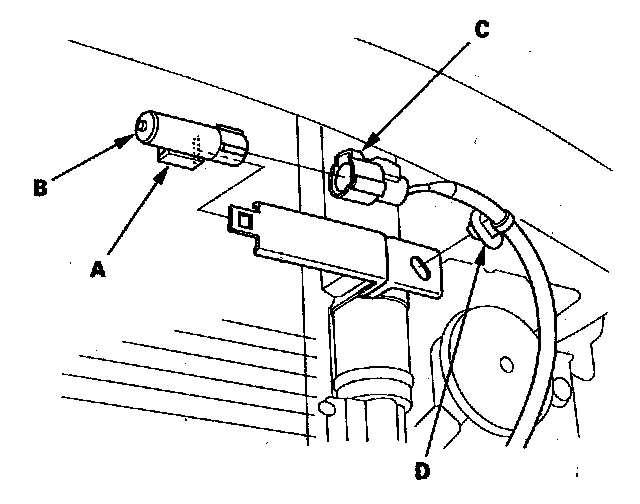 6. Lift the tab (A) to release the lock, then remove the outside air temperature sensor (B) from the receiver/dryer desiccant bracket. Disconnect the 2P connector (C), then remove the clip (D).