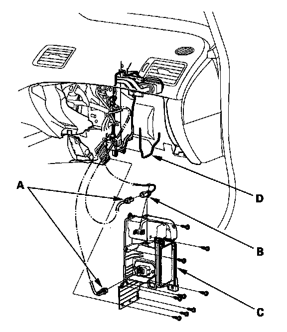 6. Disconnect the connectors (A) from the evaporator temperature sensor and the power transistor, then remove the connector clip (B). Remove the self-tapping screws, the expansion valve cover (C), and the seal (D).